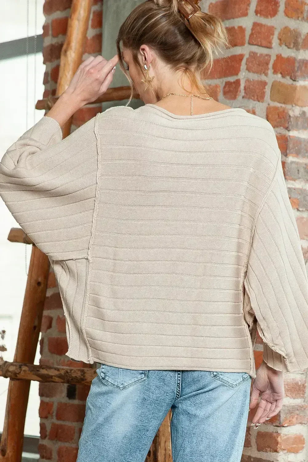 Apricot Solid Color Ribbed Knit 3/4 Sleeve Pullover Sweater